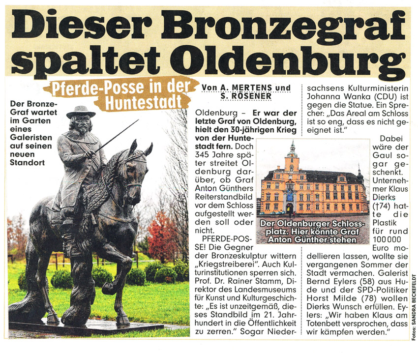Der Initiative des Trios um den früheren Oldenburger Oberbürgermeister sowie Präsident des Niedersächsischen Landtages (1990 – 1998) Horst Milde, Pferdefotograf Bernd Eylers und dem verstorbenen Modeunternehmer und Hauptsponsor der Statue Klaus Dirks ist es zu verdanken, dass diese Bronzestatue Realität wurde und letztlich doch seinen zentralen Platz in Oldenburg finden sollte.