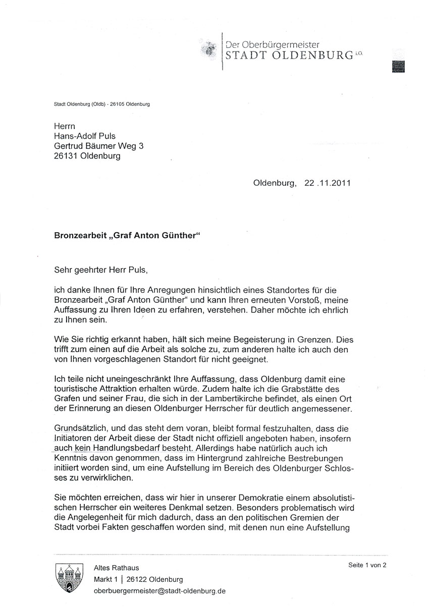 Die Arbeitsgemeinschaft der Stadtoldenburger Bürgervereine unterstützte diesen Wunsch mit einer Unterschriften-Aktion und einer öffentlichen Informationsveranstaltung vor dem Oldenburger Schloß, wobei das Denkmal für 3 Stunden aufgestellt werden durfte.