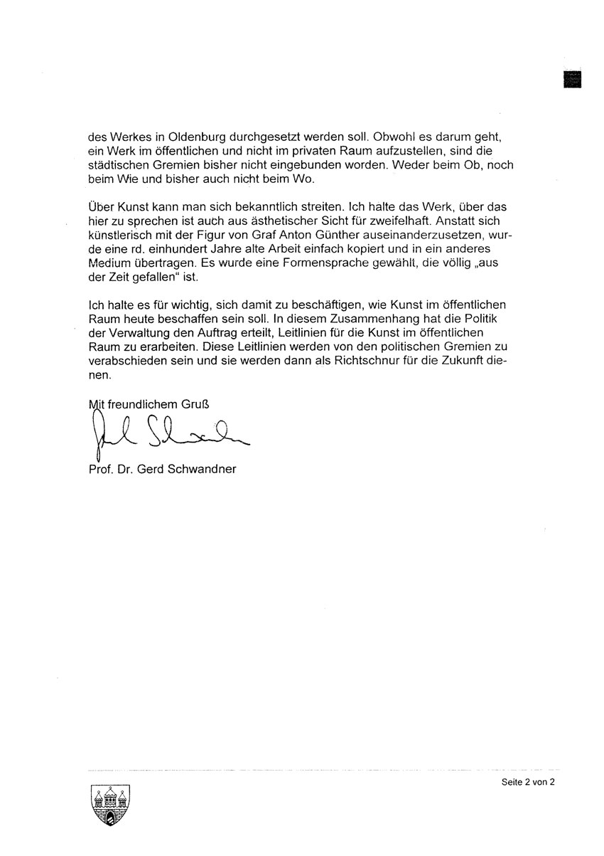 Das Kulturministerium (in dem OB-Gattin Dr. Annette Schwandner Abteilungsleiterin ist) hat jedoch eine klare Meinung. Entschlossen sagte es Nein zu einer Ausstellung auf dem landeseigenen Gelände des Schlosses. Prof. Dr. Rainer Stamm, Direktor des Landesmuseums für Kunst und Kulturgeschichte: „Es ist unzeitgemäß, dieses Standbild im 21. Jahrhundert in die Öffentlichkeit zu zerren.“